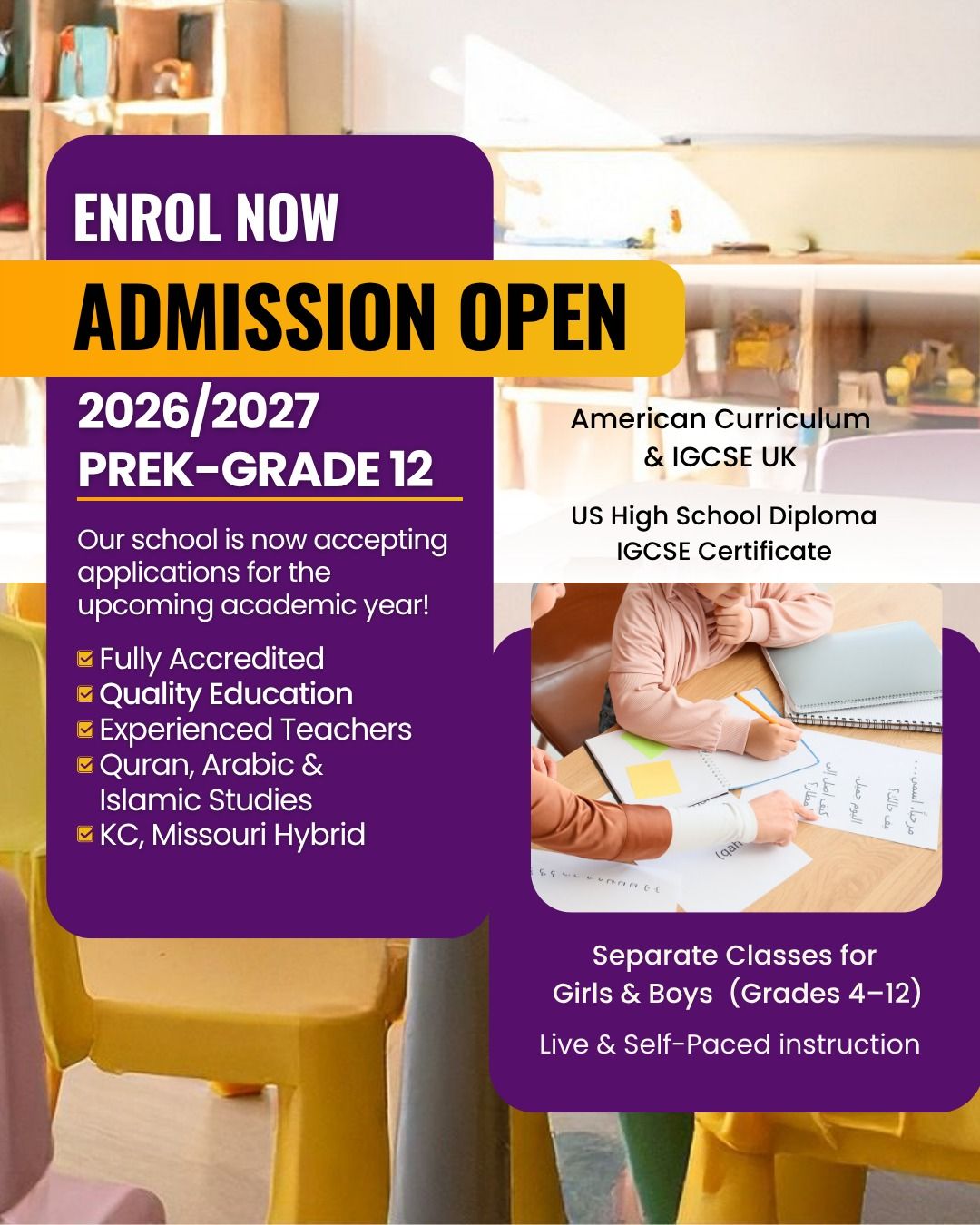 We offer a comprehensive Academic Curriculum and authentic enrichment classes for Islamic Studies, Quran and Arabic instruction. Classes are safely taught by certified live instructors from the comfort and convenience of your home.