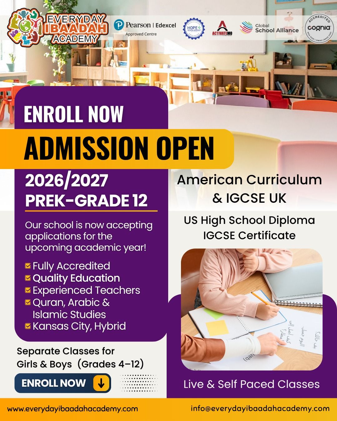 Everyday Ibaadah Academy is a private virtual school serving students in preschool to 12th grade living around the world. EDIA is registered with the California Department of Education and has been fully accredited by Cognia with NCA, CASI, NWAC and SACS CASI global recognition.